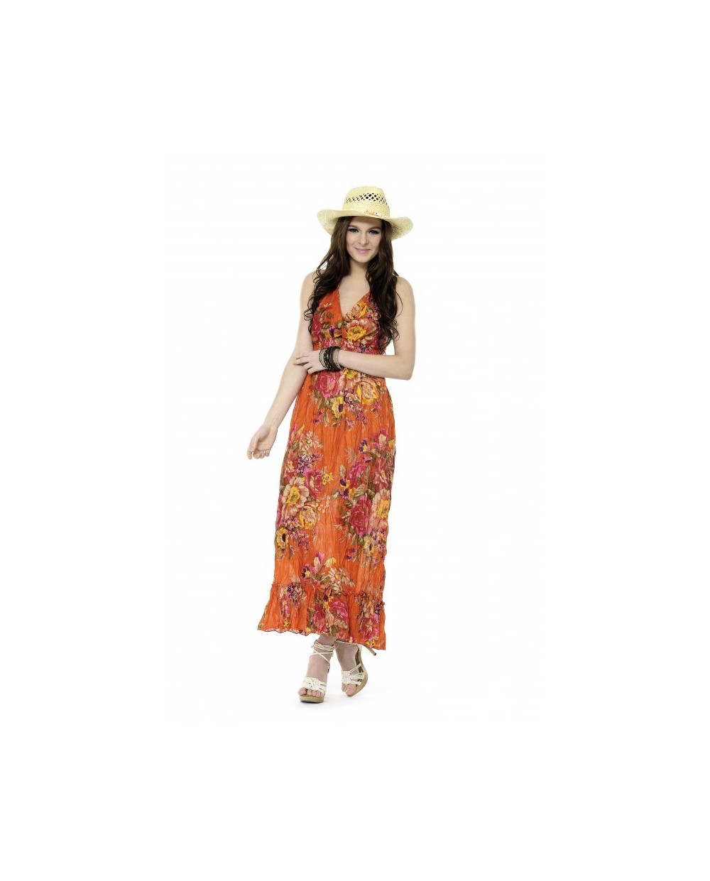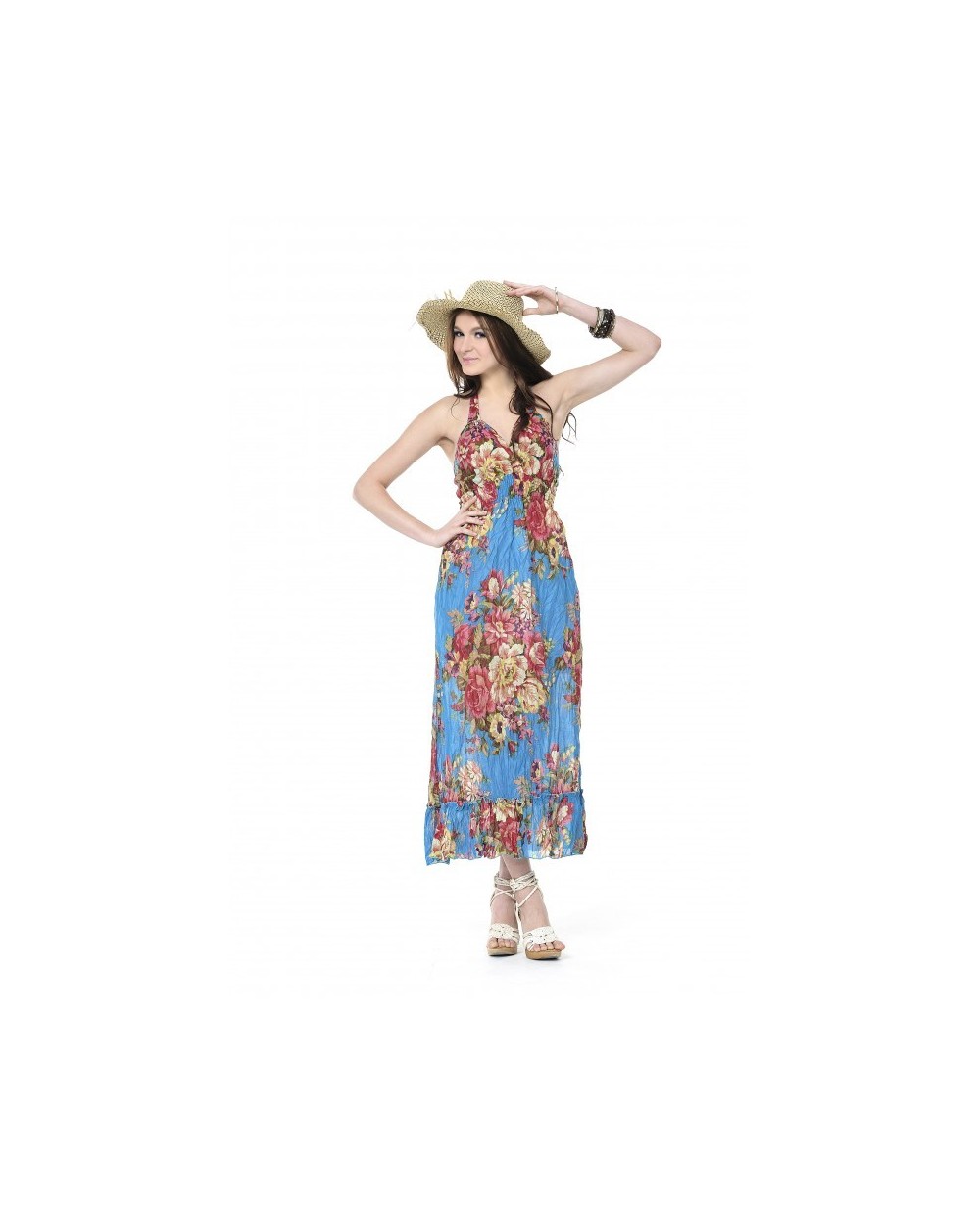 Long printed dress with thin adjustable straps. V-neckline and wiring under the bust with ruffles at the bottom of the dress.